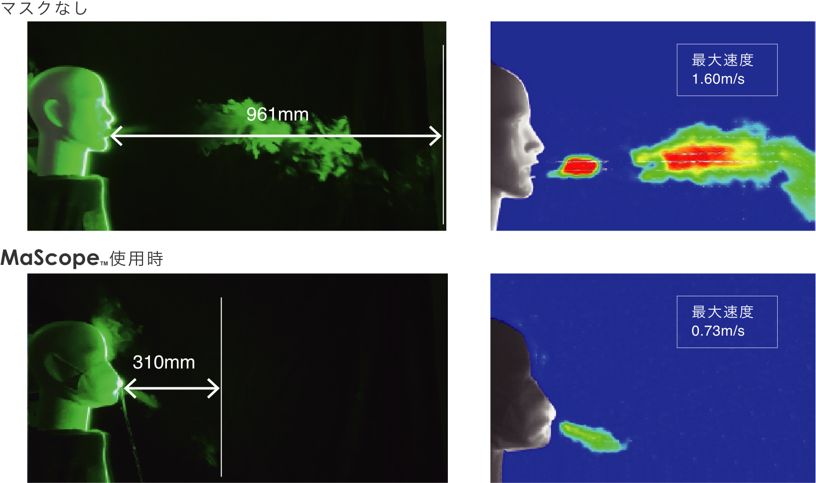 <マスクなし> 呼気の飛距離961mm、最大速度1.60m/s、